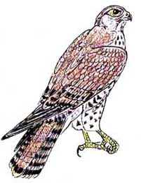 To Ukraine the birds return in late March to early April, although individual pairs winter in the southern regions. In Ukraine the birds nest across the whole territory save woodless steppes. For nesting, the Saker chooses predominantly forest gullies and meadows. Saker nests can often be seen along riverbanks or on tall alders in flooded marshland, among a nesting colony of herons. In mountainous regions the Saker prefers inaccessible cliffs. In forest massifs the Saker often resorts to occupational tactics, easily chasing the Raven, the Crow, the Buzzard, the Kite or the Heron from their nests, remaining for the entire nesting season in the colonies of above species or even in the immediate surroundings of other sakers. Most frequently, the Saker is seen to reside among Rook colonies. No marked antagonism has been observed between the Saker and rook species, this form of co-existence being evidently advantageous for the Saker. It is easy to see, after prolonged observation of the colony, just how difficult it is to pinpoint the exact location of a Saker nest surrounded by numerous Rook nests. Most amazing is that, when habitable nests are scarce, the Saker can even win a nest from a bird as formidable as the Imperial Eagle. As a rule, the Saker lays up to 5 eggs of a rather varying reddish colouring. The hatch is incubated, only by the female, for 30 days. There are rarely more than four hatchlings, which leave the nest 40-45 days after hatching.