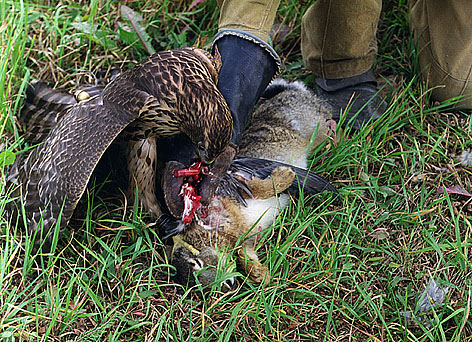 Щоб вив╕льнити зайця, соколярев╕ приходиться майстерно запропонувати сво╓му крилатому партнеров╕ тушку голуба.