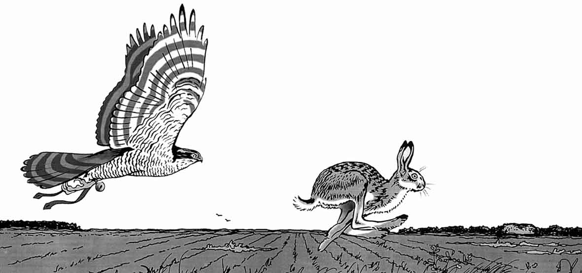 Цього разу, н╕би в╕дчуваючи можлив╕сть напуску, йшли мовчки. Через десяток крок╕в спод╕вання виправдались. Яструбиха мого товариша - молодого соколяра В╕тал╕я р╕зко прис╕ла на руц╕, узр╕вши зайця за к╕лька метр╕в збоку в трав╕. Соколяр зреагував митт╓во ╕ вив╕льнив опутц╕. Птах це в╕дчув, з╕рвався з руки ╕ по кос╕й р╕зко шугонув у б╕к озера в╕др╕заючи вухатому шлях до високих сухих стебел бур■яну. Тому н╕чого не лишалось, як кинутись в ╕нший б╕к в над╕╖ на раптовий спринтерський в╕дрив. Але птаха вгадала напрям руху. Двома потужними змахами набрала швидк╕сть, за п■ять метр╕в наздогнала ╕ вхопила хитруна. Як норовистий к╕нь, вже ос╕дланий пернатим вершником, заяць стрибнув уб╕к, раптово зупинився, а пот╕м стр╕мкко з╕рвався з м╕сця в над╕╖ скинути з себе страшну напасть. Та яструбиха вже встигла м╕цно перехопити його т╕ло обома лапами. При допомоз╕ потужних стрибк╕в заяць намагався закинути задн╕ ноги супроти нападниц╕. Це йому не вдалось, але був ще один шанс на порятунок - покотитись по трав╕ ╕ п╕д╕м■яти п╕д себе хижака. В цьому була над╕я, що птах ослабить тиск к╕гт╕в ╕ тод╕ вдасться зробити потужний скид уб╕к ╕ вирватись з болючих об╕йм. З гучним шелестом клубок напружених м■яз╕в прокотився у сухих бур■янах, але хватка була по м╕сцю - одн╕╓ю лапою за верх голови, ╕ншою за тулуб. К╕гт╕ глибоко вп■ялись в т╕ло ╕ пухнастий трофей забився у м╕цних лапах. Вс╕ швидко п╕дб╕гли до м╕сця боротьби, де в останн╕х безнад╕йних спромогах вирватись кричав ╕ борсався у срашних стисканнях коричневато-с╕рий довговухий цьогор╕чок. Яструбиха розставила крила ╕ м╕цно почергово зчавлювала к╕гт╕ то одн╕╓╖, то друго╖ лапи. Такими рухами вона намагалась перешкодити борсанню вп╕йманого зв╕ряти. Яструбиха вже мала досв╕д боротьби з к╕лькома молодими зайцями ╕ поводилась, як ╕ належить досв╕дченому мисливцю, вправно ╕ без зайвих метушливих рух╕в.